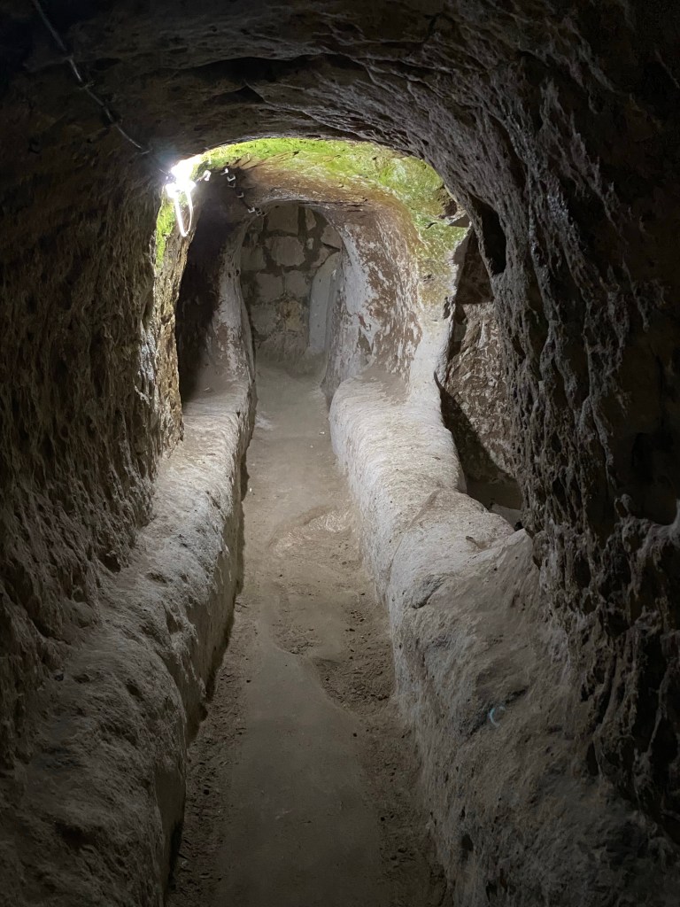 If you follow the red arrows, you will descend three stories, underground, through tunnels and stairwells and corridors carved out for people to live and move about. Ventilation systems kept the air clean and small tubes carved from one floor to the others served as a communication highway. If you follow the blue arrows, you will ascend to the surface; to the light.